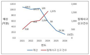 중소기업 침해사고는 매년 증가하고 있지만 정부의 정보보호 지원 예산은 되레 매년 절반 가까이 삭감돼 왔다. 특히 내년 관련 예산안은 2021년 대비 10% 수준에 그쳐 보안 사각지대가 더 확대될 수 있다는 우려가 제기됐다.뉴시스 보도에 따르면, 국회입법조사처는 이같은 내용을 담은 '정보보호 사각지대 해소를 위한 중소기업 보안 역량 강화 방안' 보고서를 25일 발표했다.중소기업 침해사고 신고 건수는 2021년 518건에서 2024년 1575건으로 3배 이상 늘었다. 올해 8월 기준으로도 1185건이 집계됐다.같은 기간 전체 신고 중