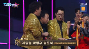 KBS 1TV '전국노래자랑 추석특집-별의 전쟁'에서 개그맨 박명수, 정준하, 지상렬로 구성된 프로젝트 그룹 '지하수'가 인기상을 수상하는 파란을 일으켰다.15일 방송된 이번 특집에서는 KBS에서 방영 중인 13개 프로그램 출연자들이 총출동해 열띤 경연을 펼쳤다. '사장님 귀는 당나귀 귀' 대표로 나선 지하수2TV 예능프로그램 '사장님 귀는 당나귀 귀'를 대표해 출전한 지하수는 최우수상과 인기상을 노리고 무대에 올랐다. 지상렬은 자신의 솔로 생활을 유머러스하게 풀어내며 "추석에는 유기견처럼 혼자 있는다"고 말해 웃음을 자아냈다. 그