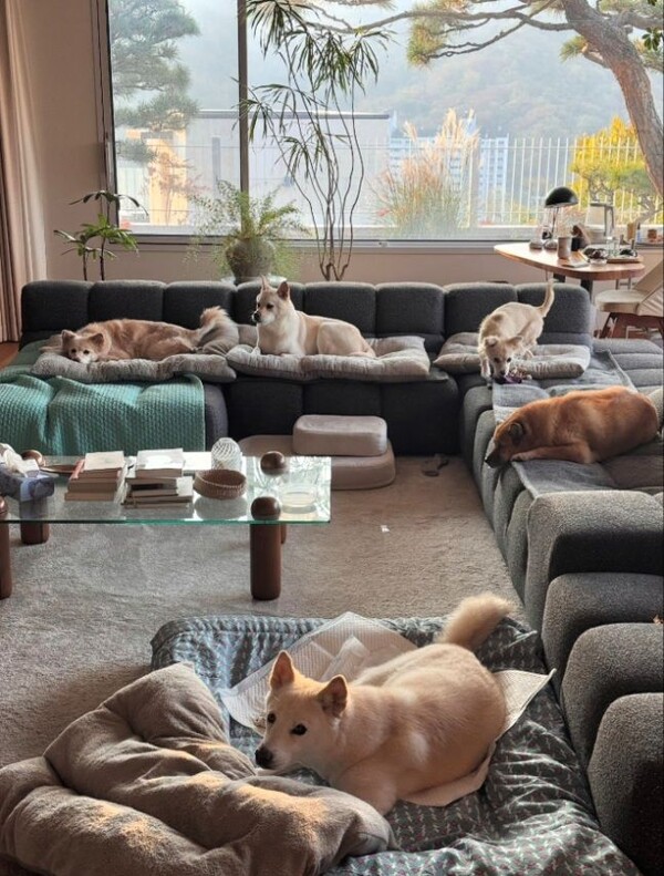 개 5마리가 각각 소파에 자리를 차지하고 앉아 있다.