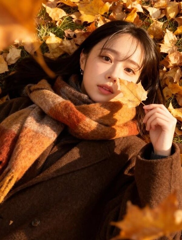 사진에는 낙엽이 수북이 쌓인 바닥에 누워 단풍을 즐기는 듯한 모습이 담겨 있다.